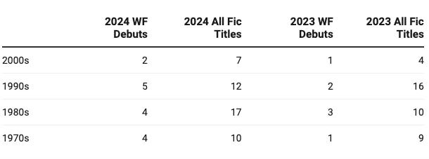 An increasing number of titles are set in decades that don’t yet make the cut for historical fiction (i.e., more than 50 years ago), with two women’s fiction debut titles set in the aughts, five set in the 1990s; four set in the 1980s; and four set in the 1970s. For context I also looked at all fiction (beyond women’s fiction and debuts) as well as the 2023 debut data, and we seem to be on an overall upward trend. The easiest way to share this info is in a table, so here you go…